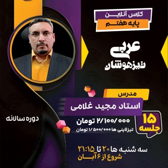 آکادمی تیزلاین کلاس عربی پیشرفته هفتم را به صورت آنلاین با امکانات ویژه طی یک دوره سالانه برنامه ریزی کرده است. این دوره شامل ۱۵ جلسه می باشد که از آبان ماه می توانید در این کلاس آنلاین کنار دورههای دیگر پایه هفتم ثبت نام کنید.